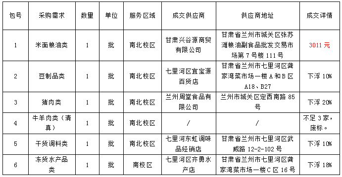 六、成交内容:兰州工业学院饮食服务中心2022年食堂大宗原材料采购项目。