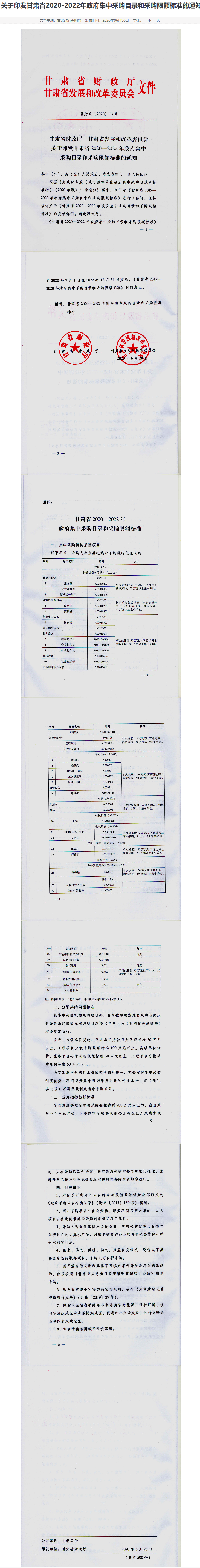 关于印发甘肃省2020-2022年政府集中采购目录和采购限额标准的通知甘财采(2020)13号